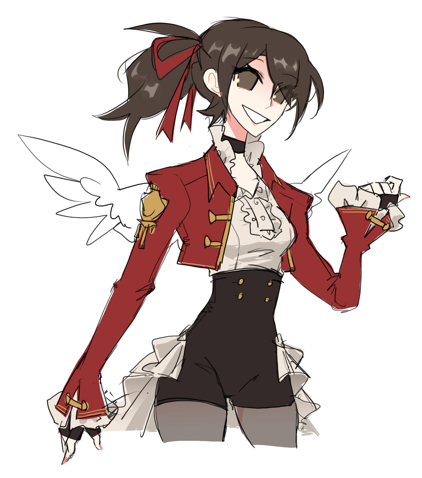 Wings: generally small but can expand in sizeEyes/Hair: Brown. Ponytail in back. Fringe/Bangs parts to her left.
